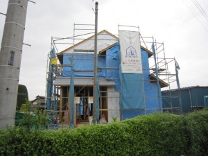 現在 木工事中のM様邸 シャープな切妻屋根の外観はソーラーパネルを乗せる為