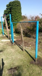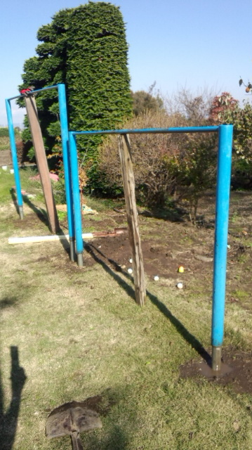 庭の邪魔にならない所を選んで穴を掘り 鉄棒をセット