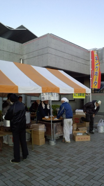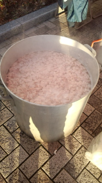 こころのブログ 2012.12.10 豚汁 早朝 早起きをして筑西市の運動場に向かいました。 9日は筑西マラソン大会 出場ではなく、商工会で豚汁を作って無料配布をする下ごしらえをする為に現地に向かいました。 大きな鍋でお湯を沸かして芋~豚肉~野菜の順に食材を入れて行きます。 寒かったので・・・・鍋をさわりさわり暖をとりながらの作業 完成間近で所用の為 帰りましたが・・・・・無事に完成して美味しく仕上がった事だろうと思います。 天気も快晴で いい大会になった事だろうと思います。