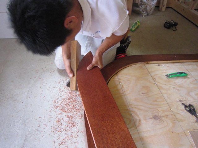 現場探訪記 2013.06.14 アールの框は・・・・ 曲線 それは 施工をさせて頂く会社にとっては・・・非常に大変な場面がある。 丁度 市内で施工中のW 様邸の玄関框を施工中の鈴木君が 何だかカンナで少しずつ削って アールを削り出しています。 何だか大変そうだね~と言うと・・・・今 見ててください(@@) ぴったりくっつけますから!!と力強い返事 難しいことにどんどんチャレンジする鈴木君 今 一番 油がのっているかもしれません(^-^) ケガだけ十分注意して 作業にあたって下さい