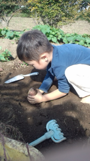 子供たちに合わせて自分も裸足になり夢中でイモを掘り始めました。