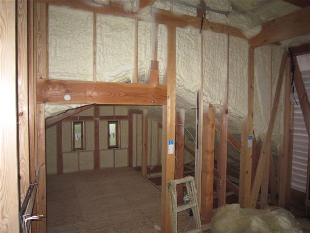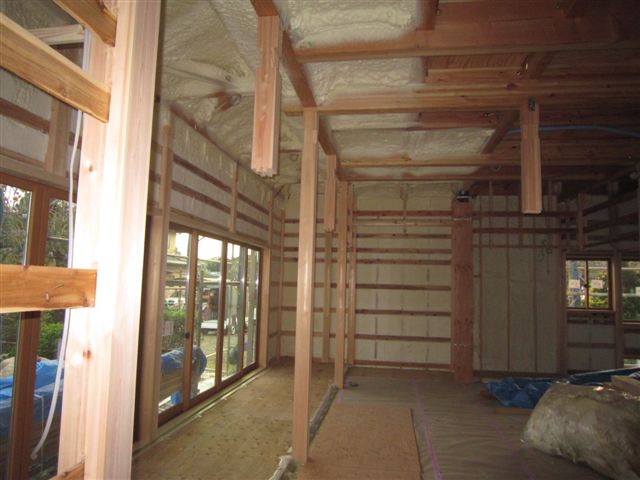 内部は吹付断熱の工事中