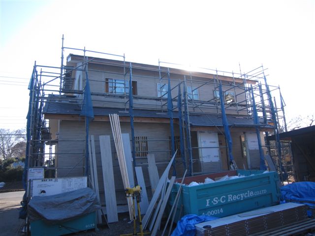 現場探訪記 2013.12.13 T様邸 (八千代町)を見てきました(^-^) 木工事中のT様邸 T様のご自宅のワンちゃんに吠えられながら 写真を取らせて頂きました。 悩みに悩んだ外壁材・・・・・・・・・奥様!!ナイスチョイスでしたね♪ 良い感じで仕上がって来ています。 チークの無垢板を貼り始めた2階(^-^) 良い感じです。S棟梁!! 宜しくお願い致します。