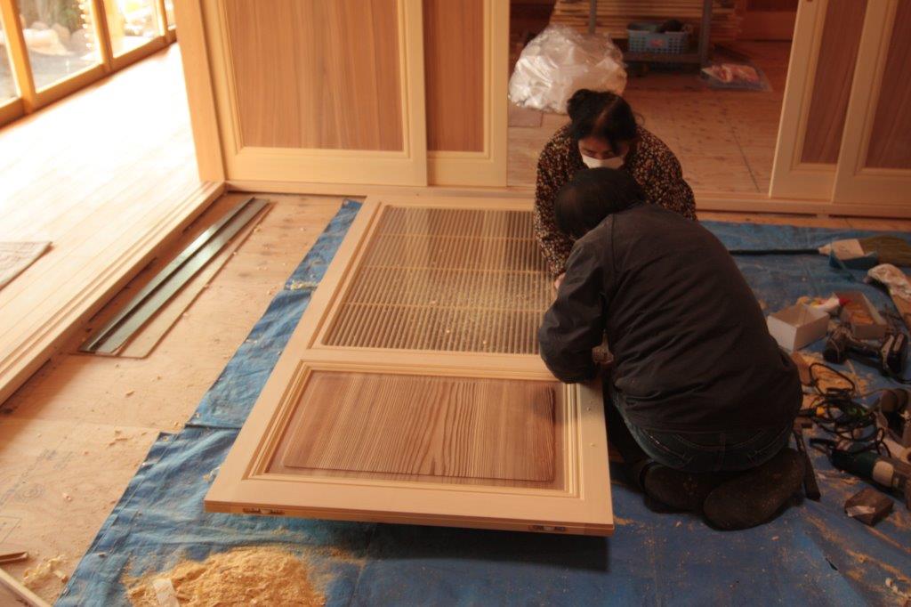 前日にはいつもの建具の取り付け専門の親方夫婦が一生懸命 展示会に向けての取り付けを