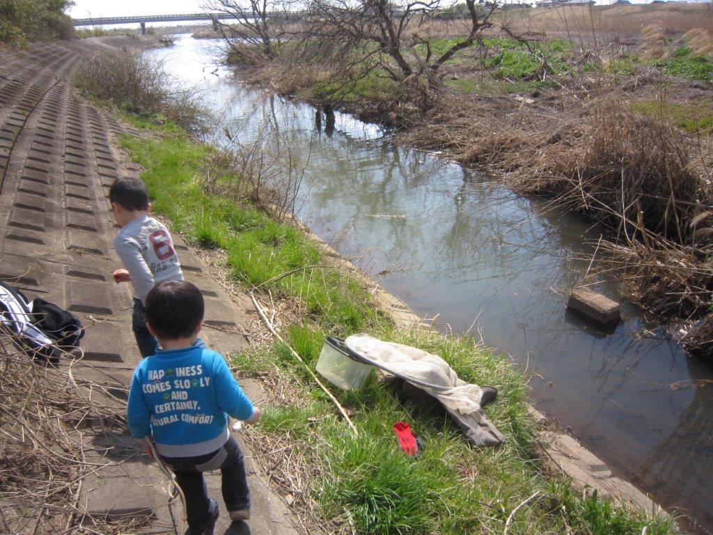 待っている間に息子と約束した魚取りに近くの小貝川に出かけました