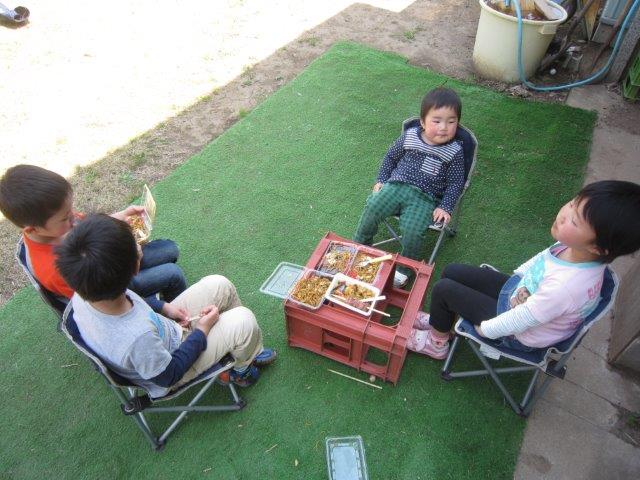 庭にイスを並べて昼食