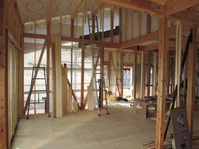 現場探訪記 2016.02.13 筑西市 木工事中 見てきました(^-^) 現在 施工中の現場に行ってきました 遮熱のタイベックシートを張り終え 吹き付け断熱の準備完了です 外部も塗り壁の下地が始まりましたので 順調です 屋根も勾配を緩めにしてみました(^-^) 良い雰囲気です