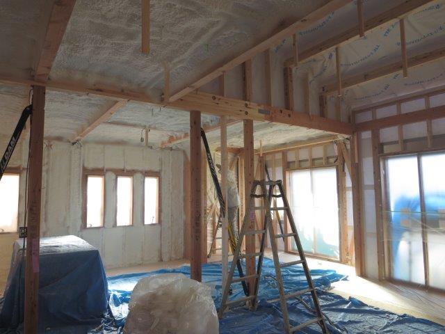 現場探訪記 2016.02.17 吹き付け断熱 アクアフォーム 施工中 市内で施工中の現場で吹き付け断熱を施工中です じっくり ふくらむ まで施工を見ていました パンが酵母菌で大きくなって行く感じで 見ていて面白い(^-^) 室内がどんどん暖かくなっていく感じがします 断熱サッシを使用しているので これから暖かくなっていく季節にありがたみが 半減してしまいそうですが 良い感じです(^-^)