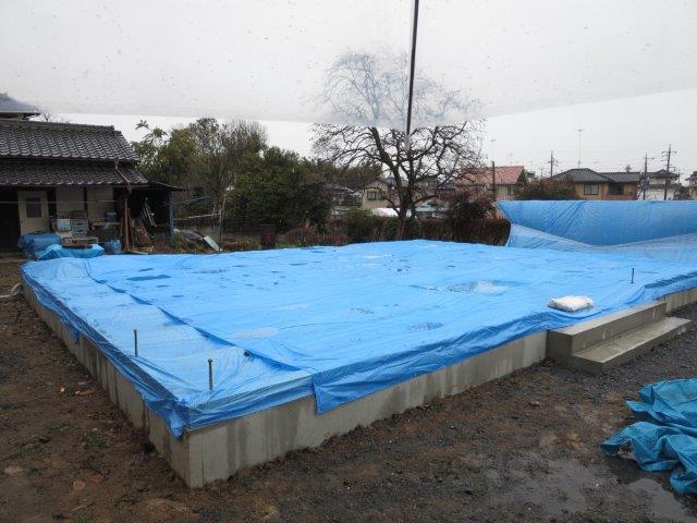 雨の中 しっかりと包まれた建物の土台