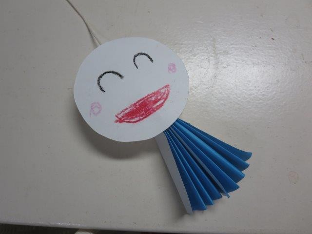明日晴れるんだ!!と今時のてるてる坊主を自慢げに見せるチビ助