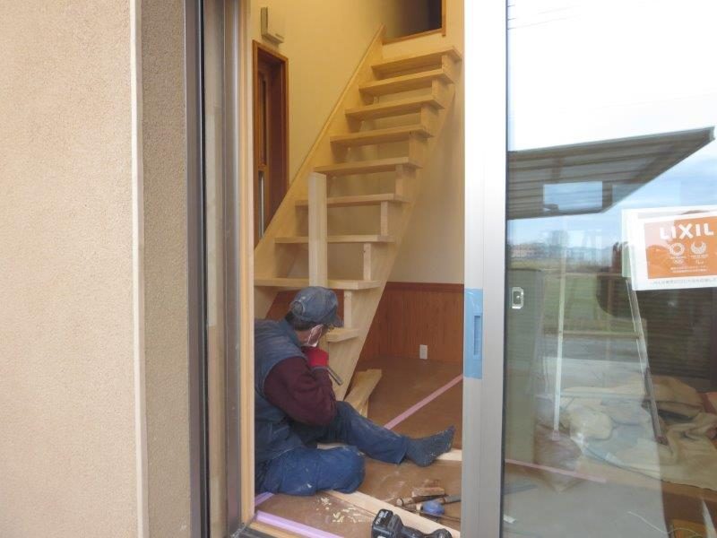 現場探訪記 2019.02.08 階段 造作・・・匠の技 W棟梁 改修中のT様邸で W棟梁が板を刻み 階段を造ってくれています ノミやカンナを使い昔ながらの手法で釘を使いません(@@) さすがW棟梁 匠の技(^-^)