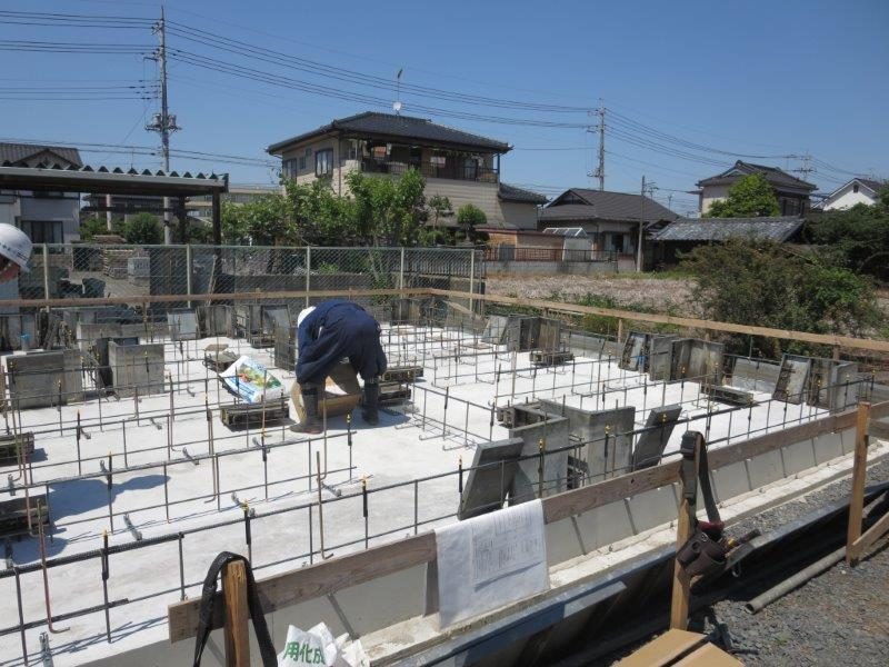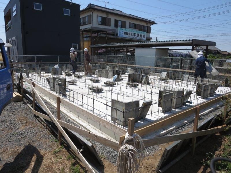 現場探訪記 2019.05.25 基礎工事中 筑西市伊讃美 T様邸 市内で施工させて頂いておりますT様邸住宅新築工事 先日打設させて頂いたベースコンクリートが太陽の光に照らされて白い砂浜の上にいる様な(笑) 型枠を定位置に運びこれから墨で印した場所に設置して行きます イイ感じで組み上がる基礎 来月の上棟に向けて余裕を持って完成しそうです(^-^)