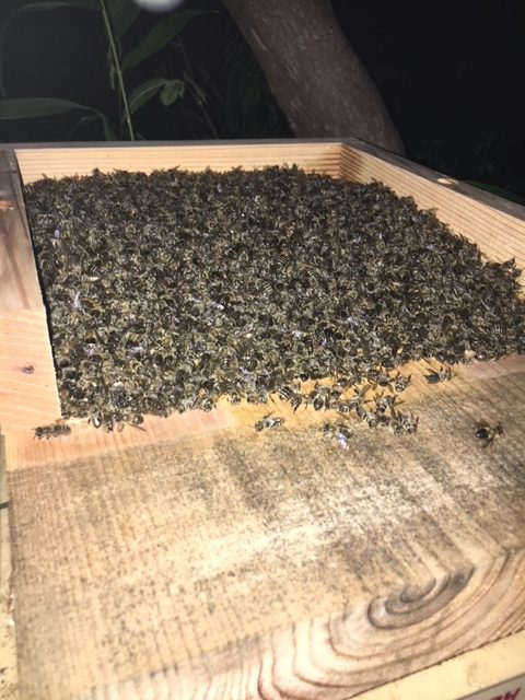 急いで巣箱を持ちあげ中身を見てみると・・・4~5千匹は やられてしまった状況