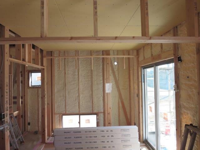 瓦工事も終わり現在 サッシ等を付け 吹き付け断熱の下地を施工させて 頂いて……