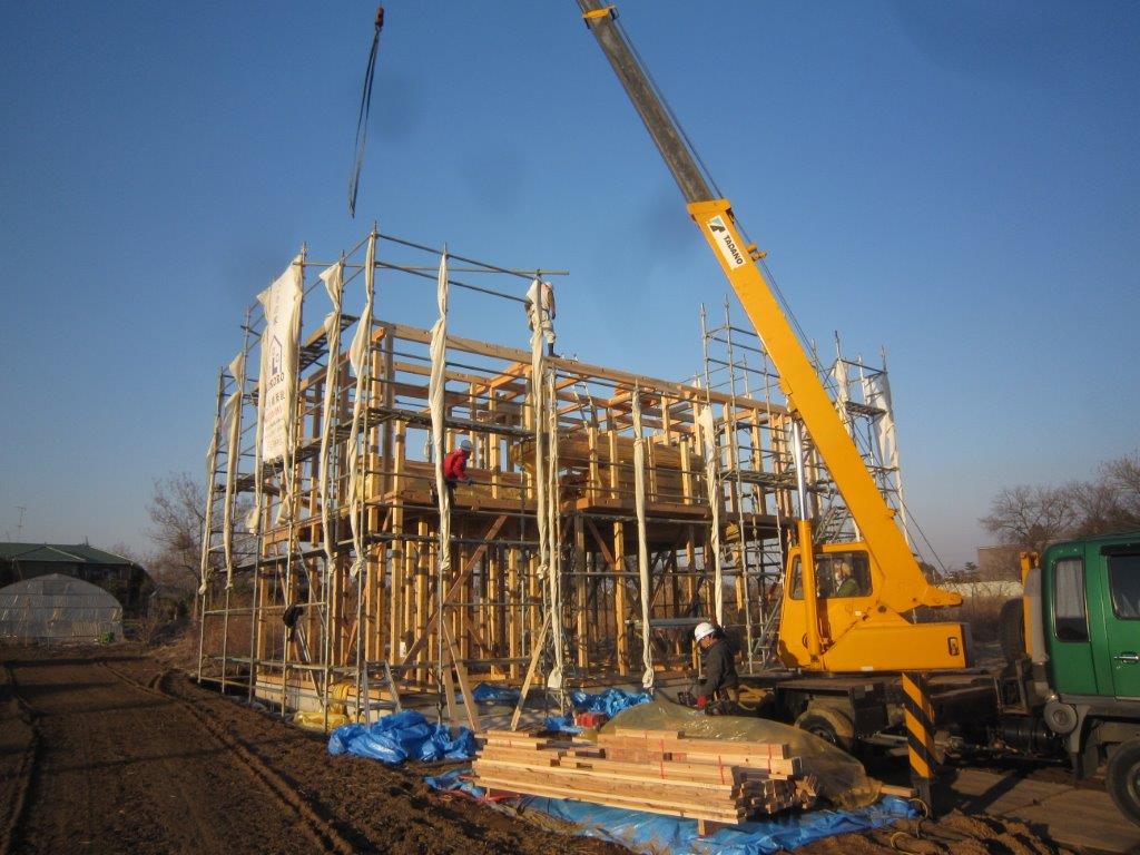 16日 今日は待ちに待った上棟の日 A様の現場は昨日からレッカーを入……