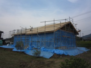 茨城県筑西市関本 H.N様邸 現在 木工事中 むくりの屋根に瓦が葺き終り雨の……