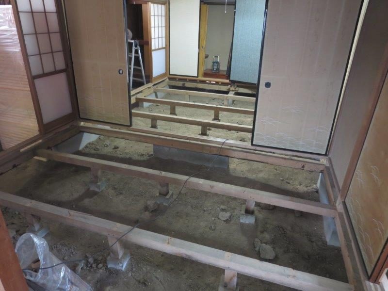 畳の床などを解体し 下地施工途中の状況です K棟梁が黙々と作業を進……