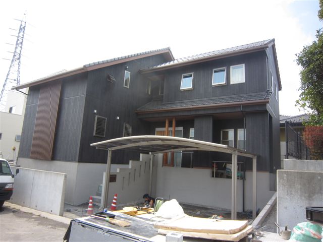 市内のN様邸の現場に行ってきました。 1階の化粧垂木が完成し瓦……