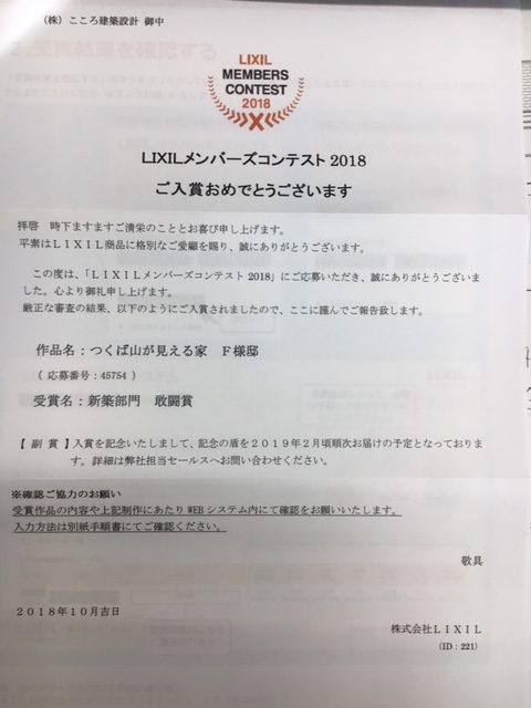 昨日 会社にLIXILから封書が届き 開けてみると F様邸の建物が敢闘賞 ……