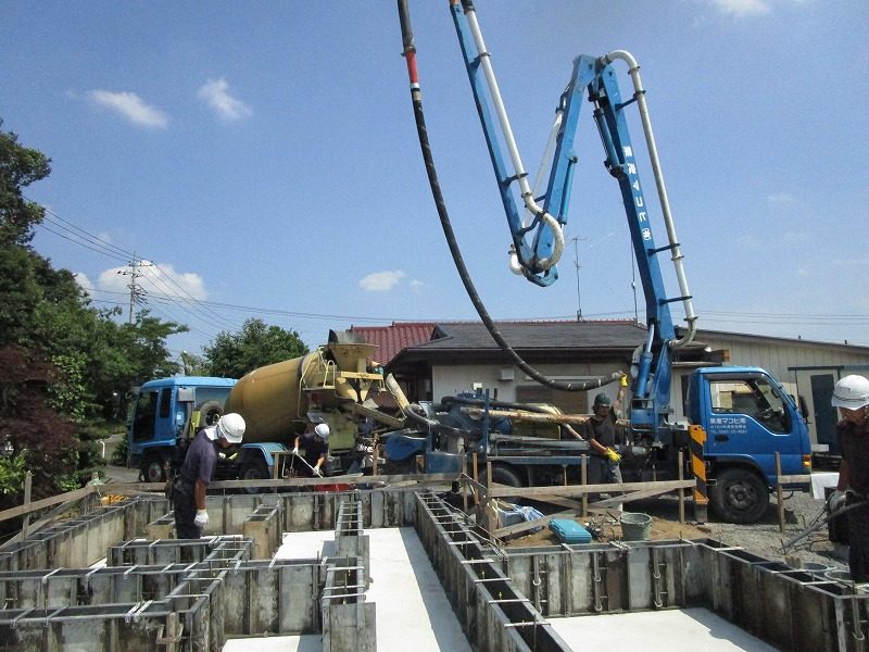 立上りのコンクリートの打設を行っているT様邸住宅新築工事 打設途中……